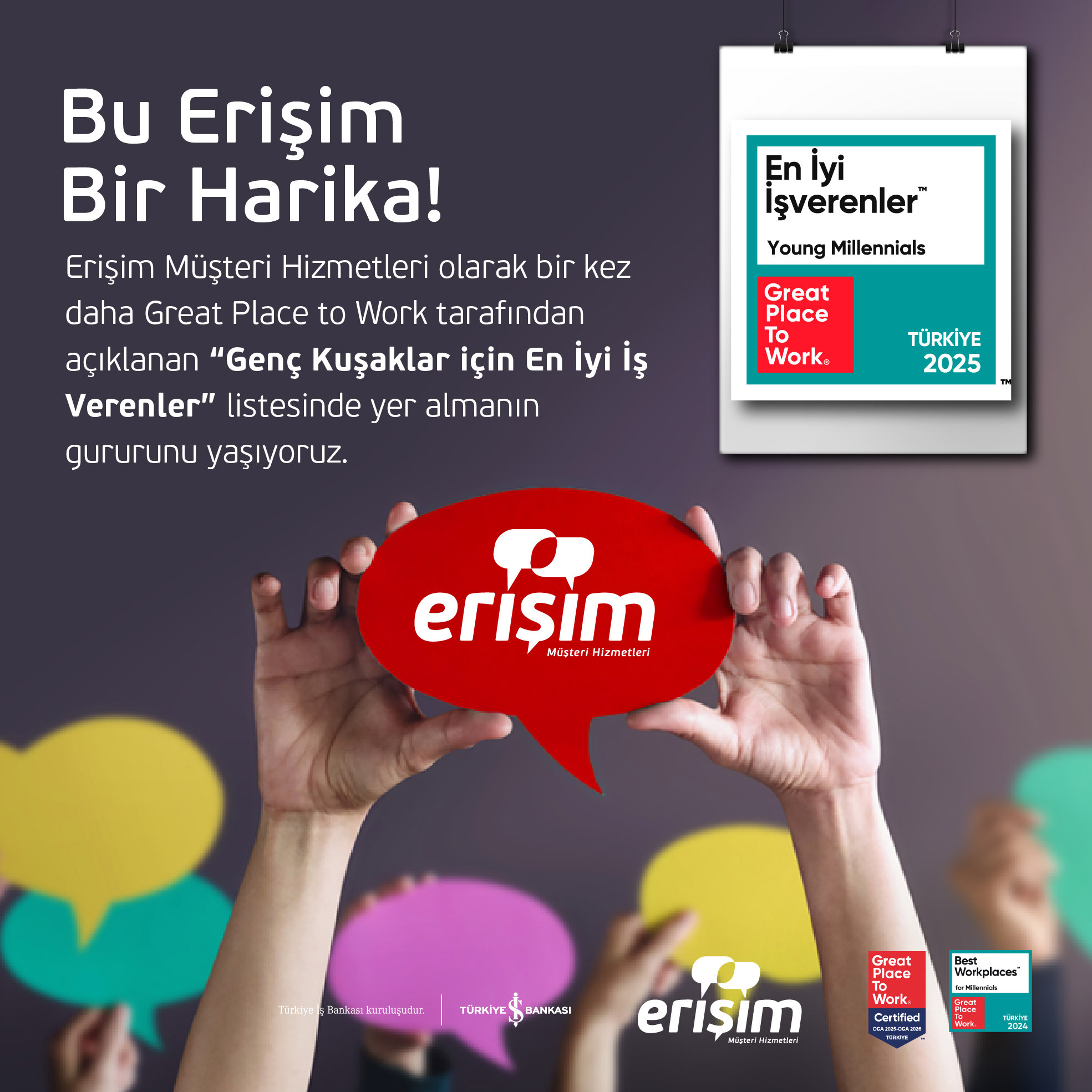 Erişim Müşteri Hizmetleri olarak ''Genç Kuşaklar için En İyi İşverenler'' listesinde 2. kez yer almanın mutluluğunu yaşıyoruz.